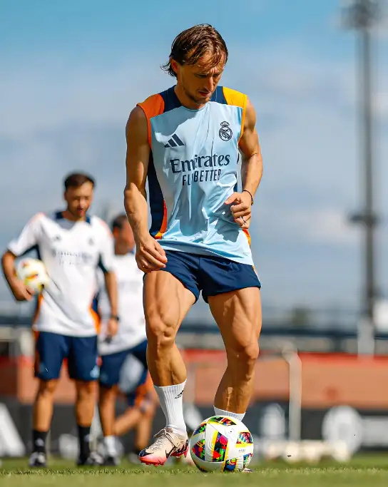 为了让大家直观对比一下,我再拿莫德里奇的这张照片给大家看看。他1米72的个子,身上的肌肉是多么强壮,那大腿粗到什么样子。